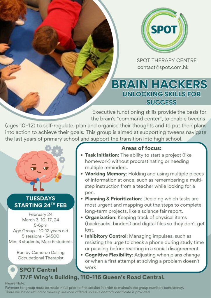 Brain Hackers - Unlocking Skills for SuccessExecutive functioning skills provide the basis for the brain’s “command center”, to enable tweens (ages 10-12) to self-regulate, plan and organise their thoughts and to put their plans into action to achieve their goals. This group is aimed at supporting tweens navigate the last years of primary school and support the transition into high school.