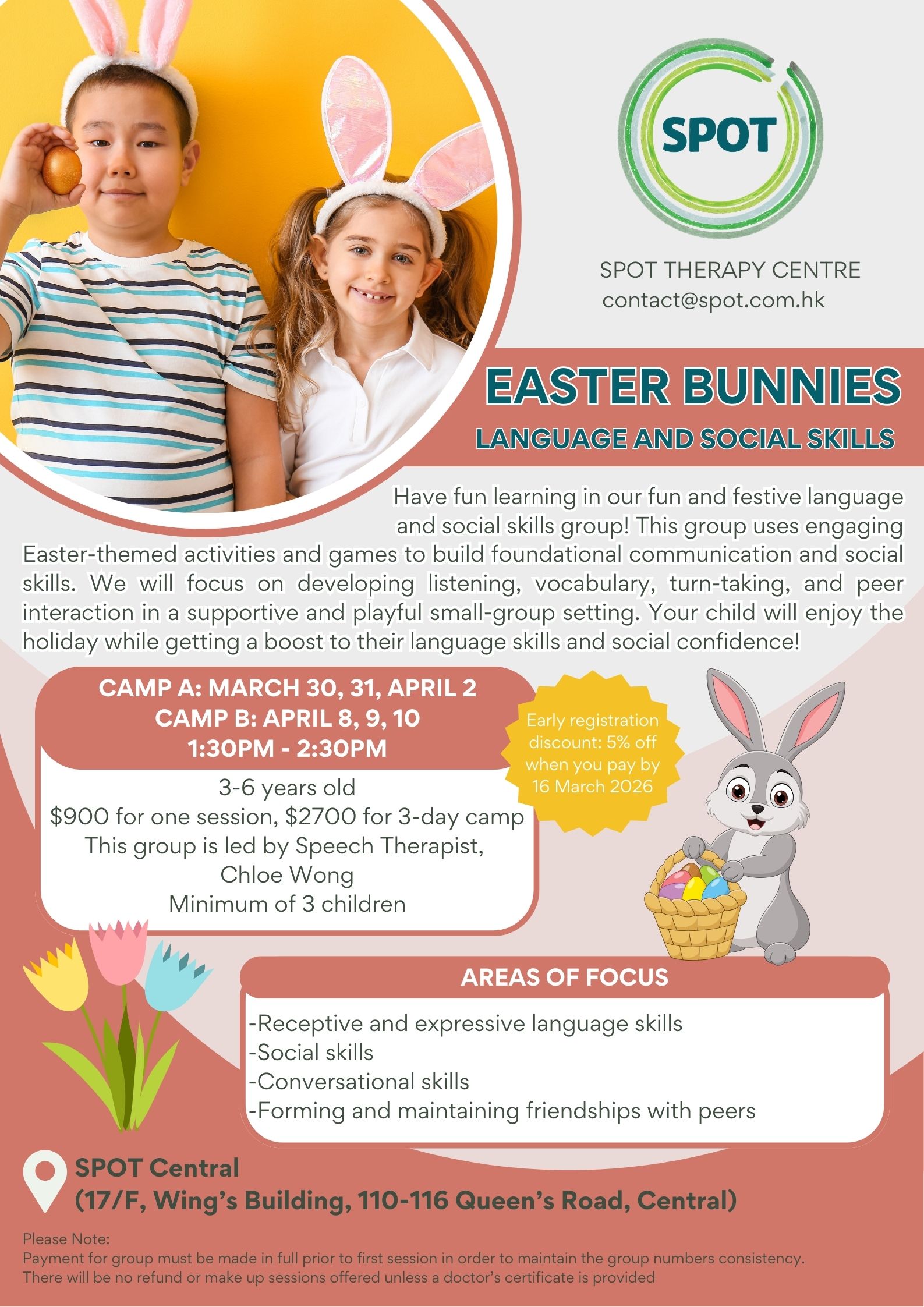Easter Bunnies (Language and Social Skills) - Easter CampHave fun learning in our fun and festive language and social skills group! This group uses engaging Easter-themed activities and games to build foundational communication and social skills. We will focus on developing listening, vocabulary, turn-taking, and peer interaction in a supportive and playful small-group setting. Your child will enjoy the holiday while getting a boost to their language skills and social confidence!